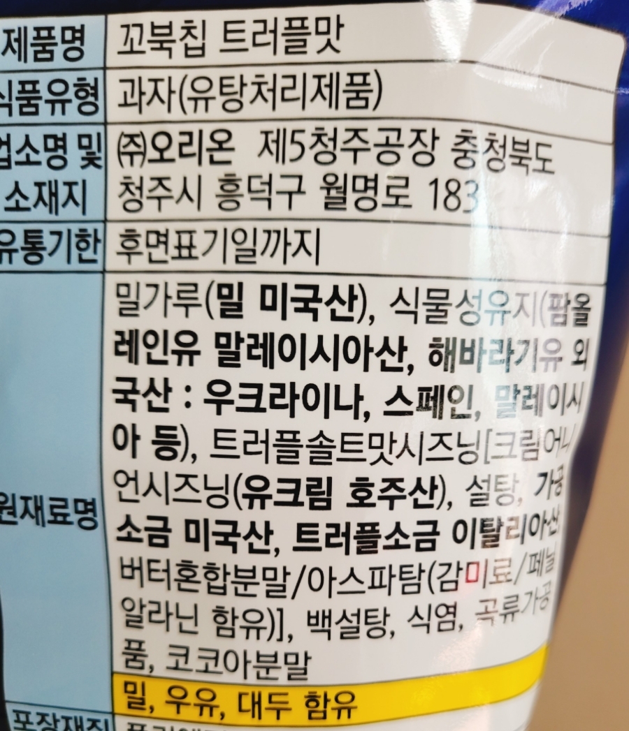 오리온꼬북칩 트러플맛을 위해 이탈리아 트러플솔트0.2%(건조트러플1.7%)가 함유된 트러플솔트맛시즈닝,크림어니언시즈닝,미국산 가공소금,