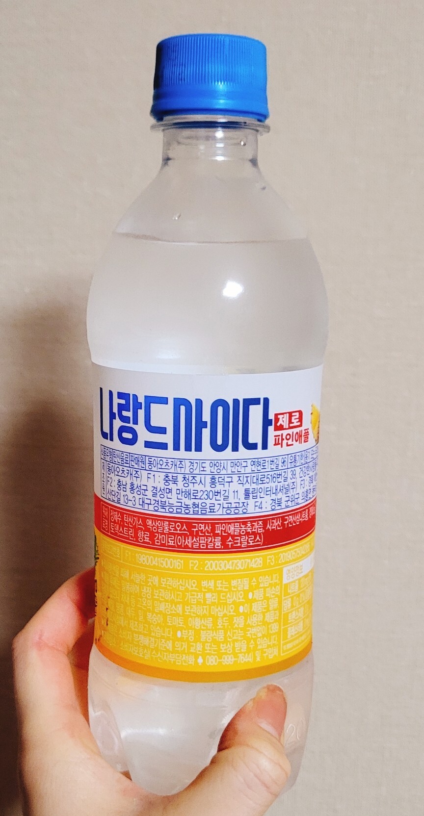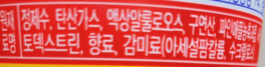 나랑드사이다 파인애플을 위해 고형분이 무려 70%나 들어간 농축과즙 0.055%,제로음료를 위해 설탕이아닌 대체당 액상알룰로스,정제수,톡쏘는 맛을 위한 탄산가스,새콤한 맛을 더해줄 구연산,다른 감미료 아세설팜칼륨,수크랄로스가 들어있다