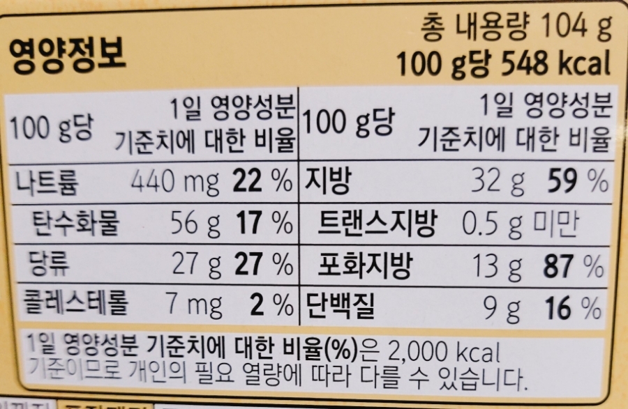 총 104g중 100g기준 1일 영양성분 기준치비율은 2000kcal기준