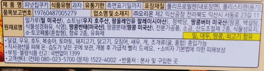 오리온 피넛칩 쿠키를 위해 피넛버터의 핵심재료인 땅콩12.3%, 피넛버터 10.8%, 탕콩분태