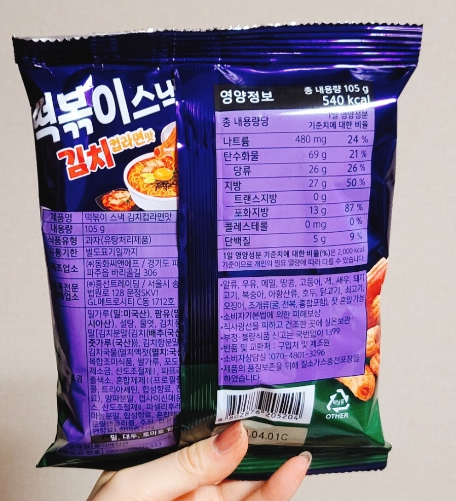봉지 뒷면에는 원재료명, 영양정보, 알러지주의사항, 제조업소,유통기한 등이 아주 큼직하게 적혀있다