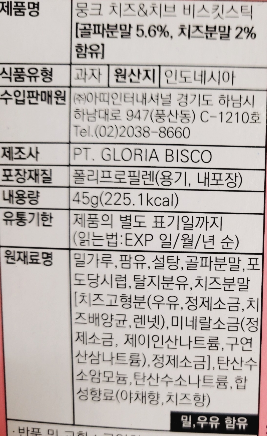 뭉크 치즈&치브 비스킷 스틱맛을 위해 골파분말 5.6%,