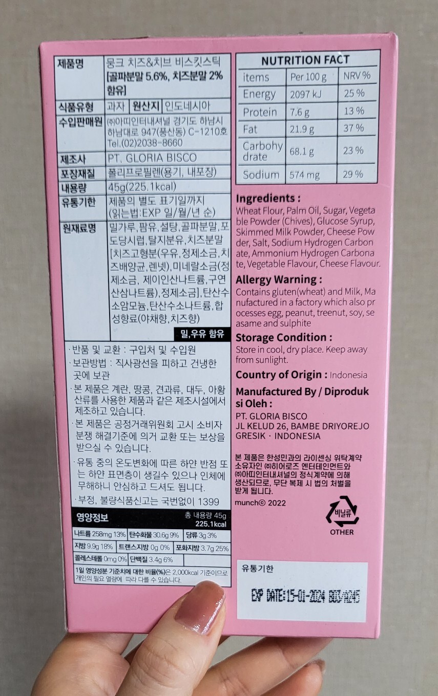 역시나 다른 과자들처럼 영양정보,제품명,원재료가 뭐가들었는지,유통기한,제조사,내용량,포장재질 등이 나와있는데 인도네시아에서 온 OEM 제품이라