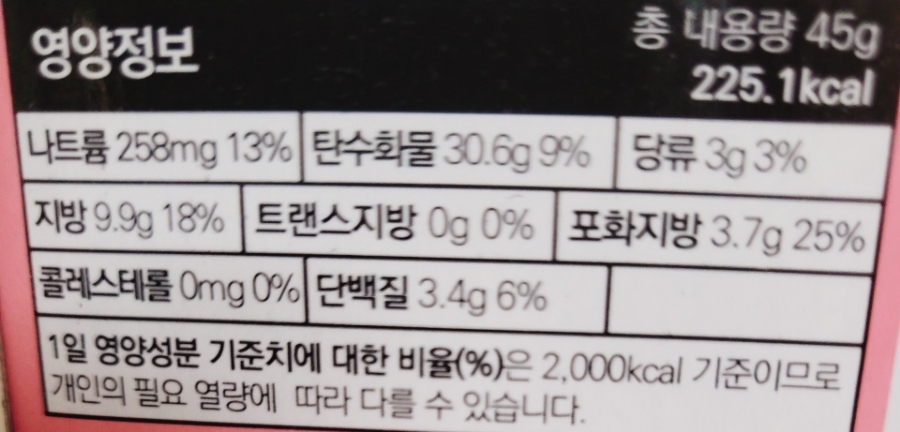 영양정보를 살펴보면 총 내용량 45g기준 225.1kcal라는데