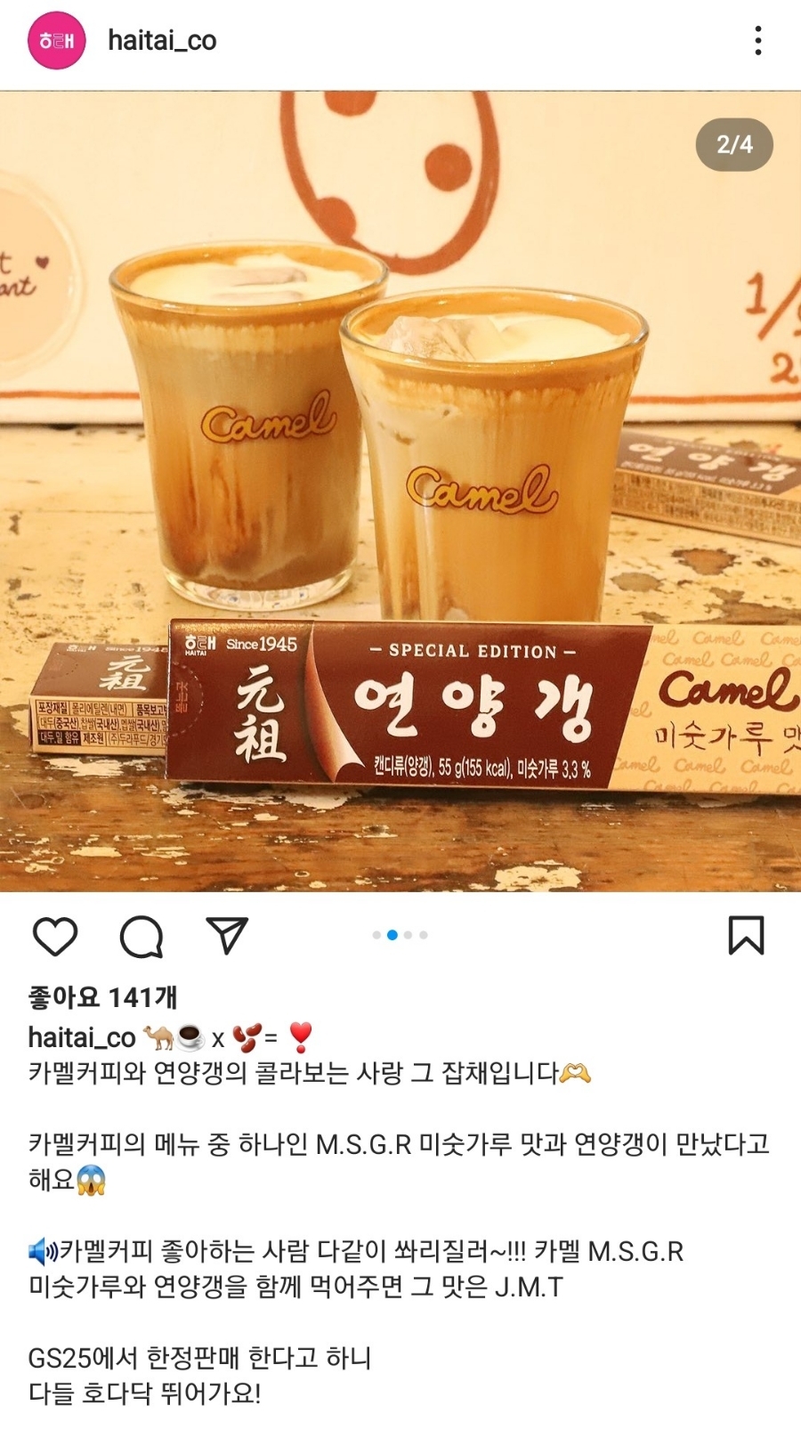 제가 이번양갱이 카멜커피와 콜라보로 탄생했다고 말씀드렸는데요 해태인스타를 보면 그 메뉴중 하나인