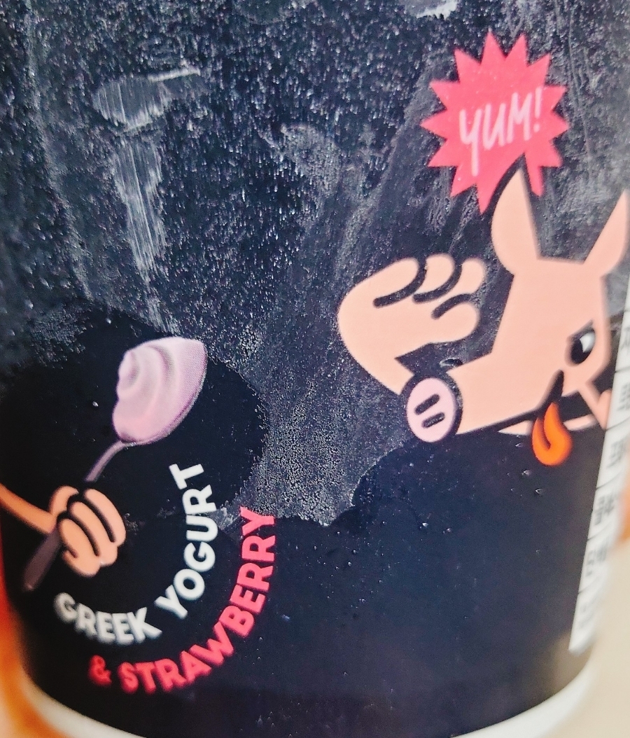 새겨져 있다 그 바탕에는 배경으로 그릭요거트와 딸기하나가 콕 박혀있다