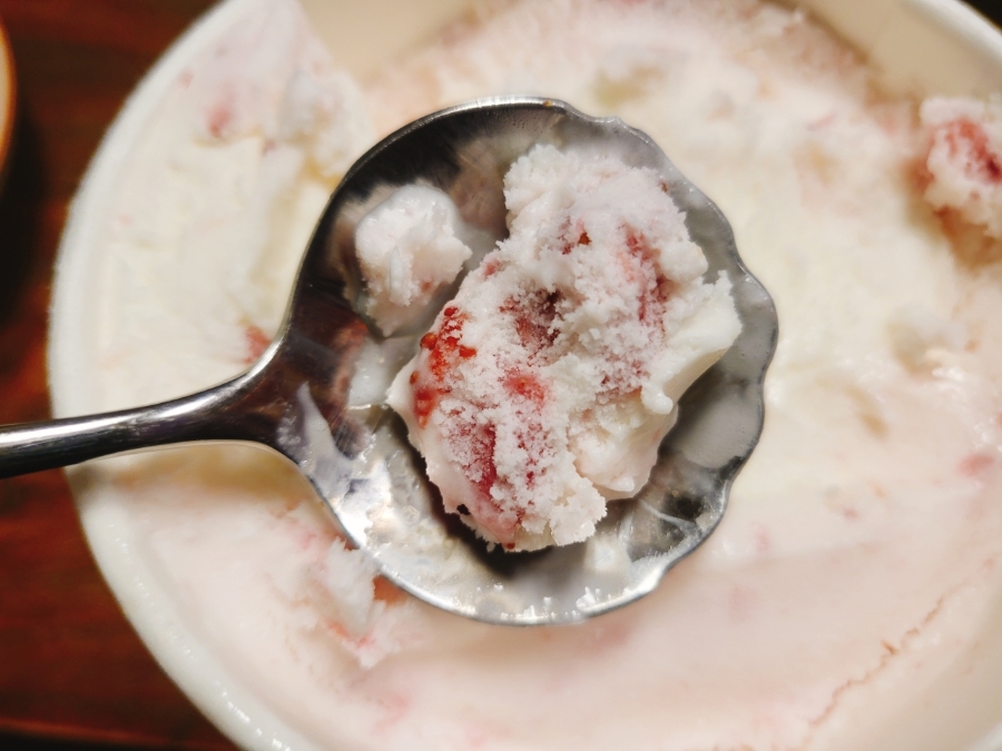 이미 캡에도 이미지가 그려져 있기도하고 내가 상상한 것을 뒤엎는!! 뚜껑을 열었는데 내가 생각한 것과는 많이 다른 비주얼에많이 당황스럽지만(이미 복숭아그릭요거트를 먹은 직후라 전체적으로 딸기요거트 색상에 딸기과육이 콕콕 박혀 있을거라고 생각) 실제 비주얼은 탈기요가트 회오리버전에 가깝다 연분홍빛 색인 부분도 있고 새하얀 도화지가 생각나는 부분도 같이 있어서 아쉬웠다