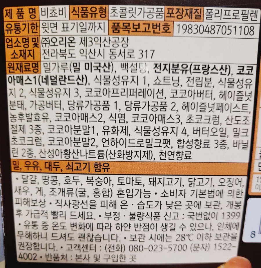 주재료인 밀크초콜릿36%, 헤이즐넛1.8%,프랑스산 전지분유,코코아매스,밀가루등이 들어있고