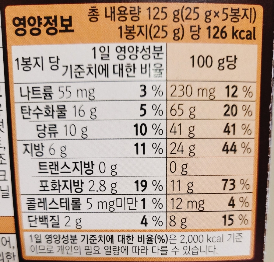 총 내용량 125g 5봉입 중 1봉 기준126칼로리에