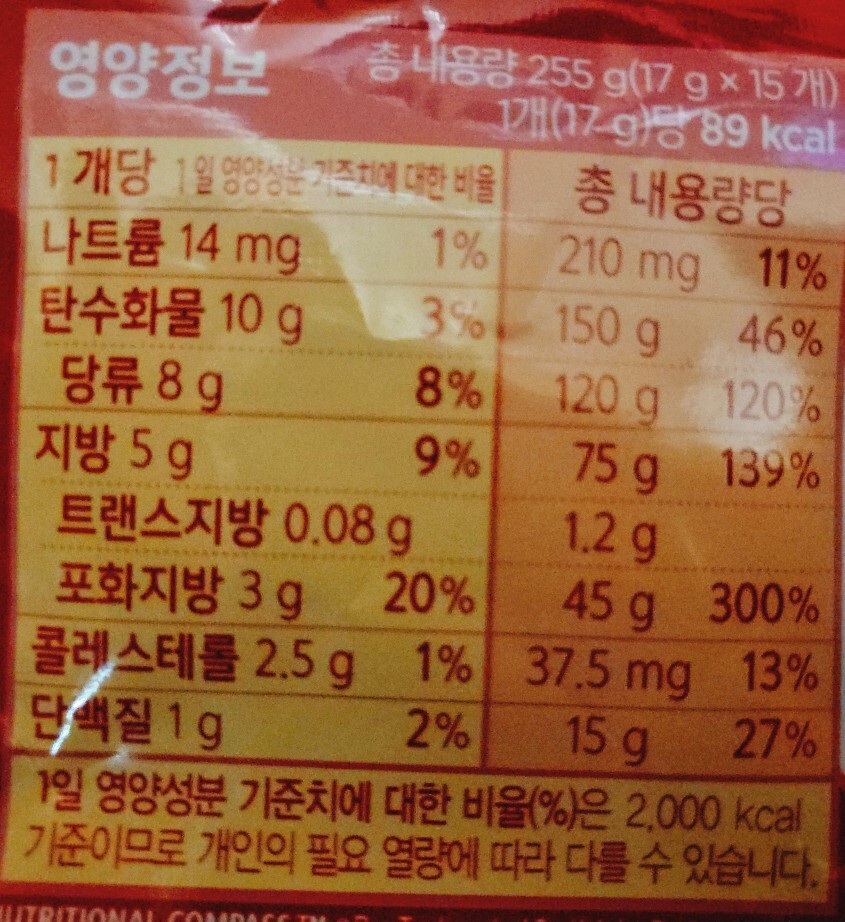 1개 기준 나트륨1%, 탄수화물3%, 당류8%,지방9%, 포화지방20%,콜레스테롤1%,단백질2%,