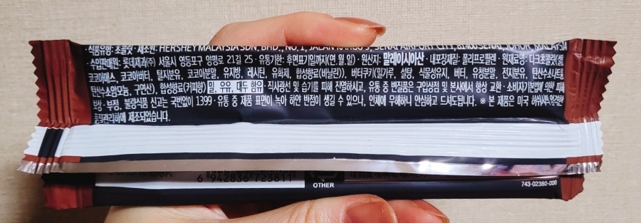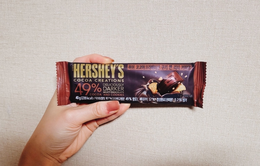 허쉬 코코아크리에이션 쿠키앤리치커피를 위해 87%의 다크초콜릿,버터쿠키12%,커피향 합성향료가 0.2% 코코아분말,탈지분유,바닐린,유지방,유화제,식물성유지